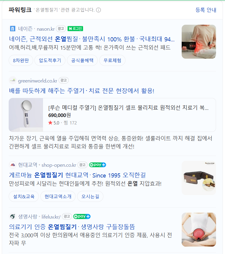 단순히 광고를 걸어두는 것만으로는 충분하지 않습니다. 아래와 같이 광고 전략을 세우면 더 좋은 성과를 얻을 수 있습니다. 다음은 파워링크 광고 예시 화면입니다. 우측에 '광고'라고 표시되어 있는 것을 볼 수 있습니다.