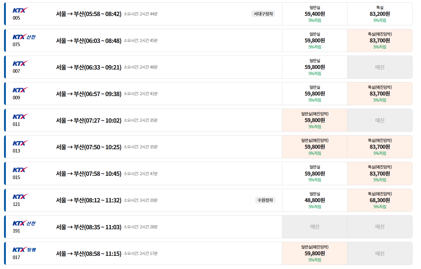 - 특실: 더 넓은 좌석과 추가 서비스를 제공하며, 일반실보다 요금이 높습니다.