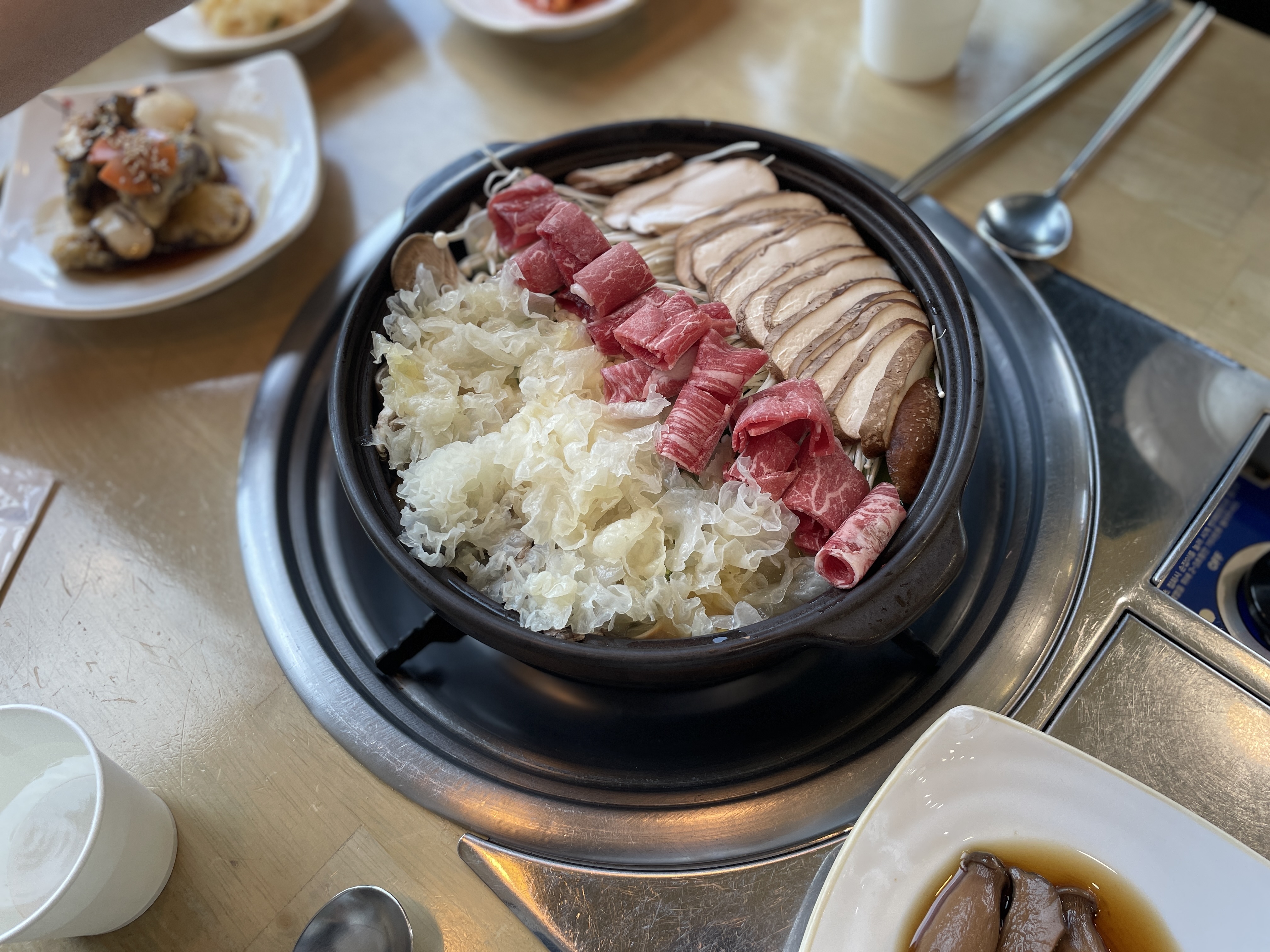 버섯전골을 시키고 나중에 야채/버섯과 샤브샤브고기를 추가해서 먹고 마지막으로 볶음밥까지 시켜먹었다.