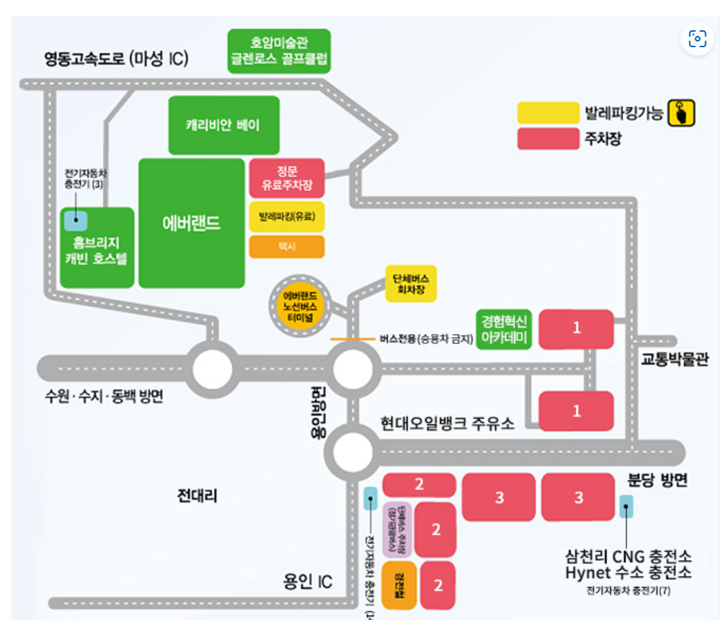 가면서 주차장을 찾아보는데, 에버랜드 주차장은 정문에 바로 위치한 유료 주차장, 셔틀을 타고 이동해야하는 무료 주차장, 그리고 발레파킹 주차장이 있었다.