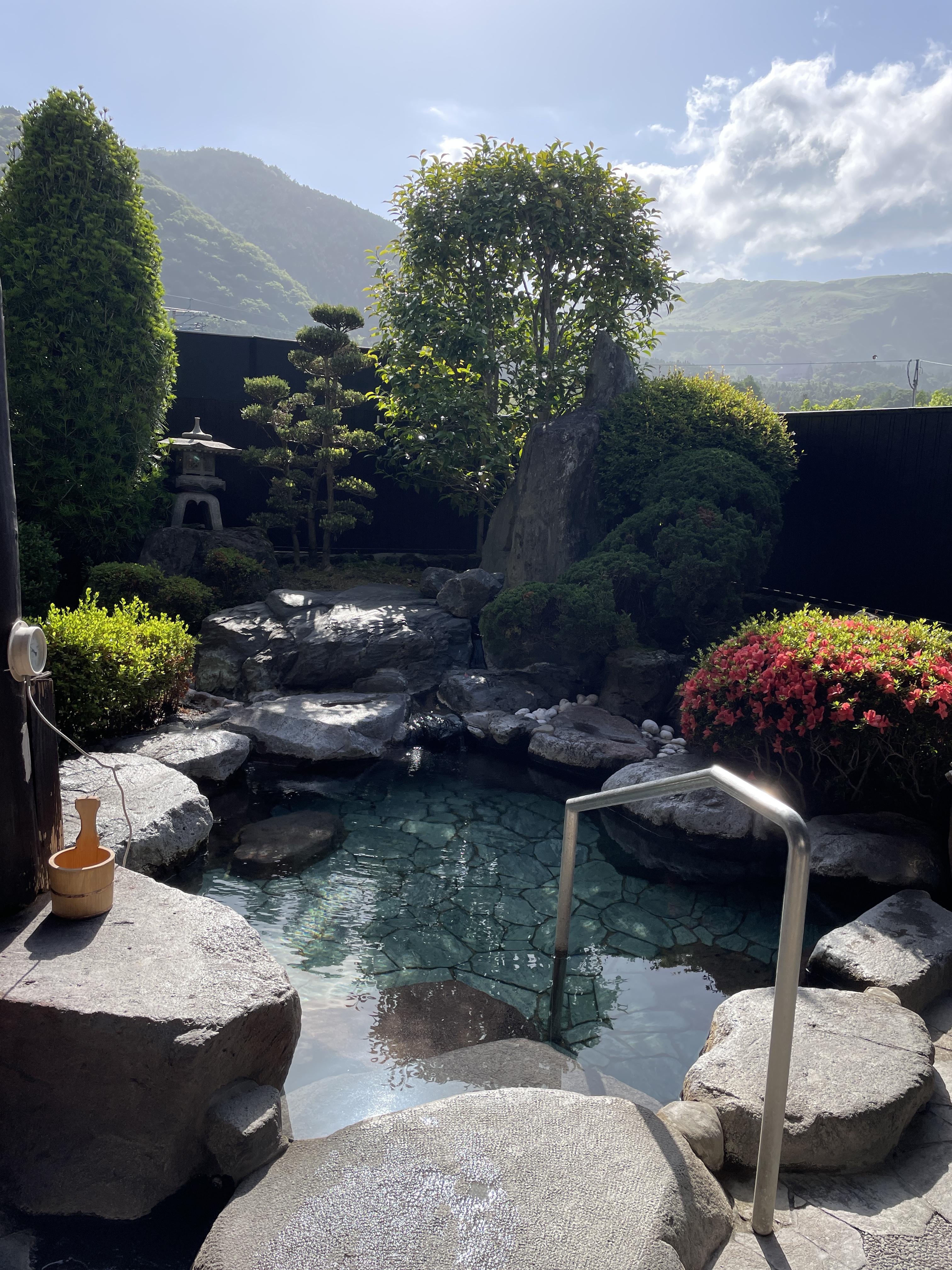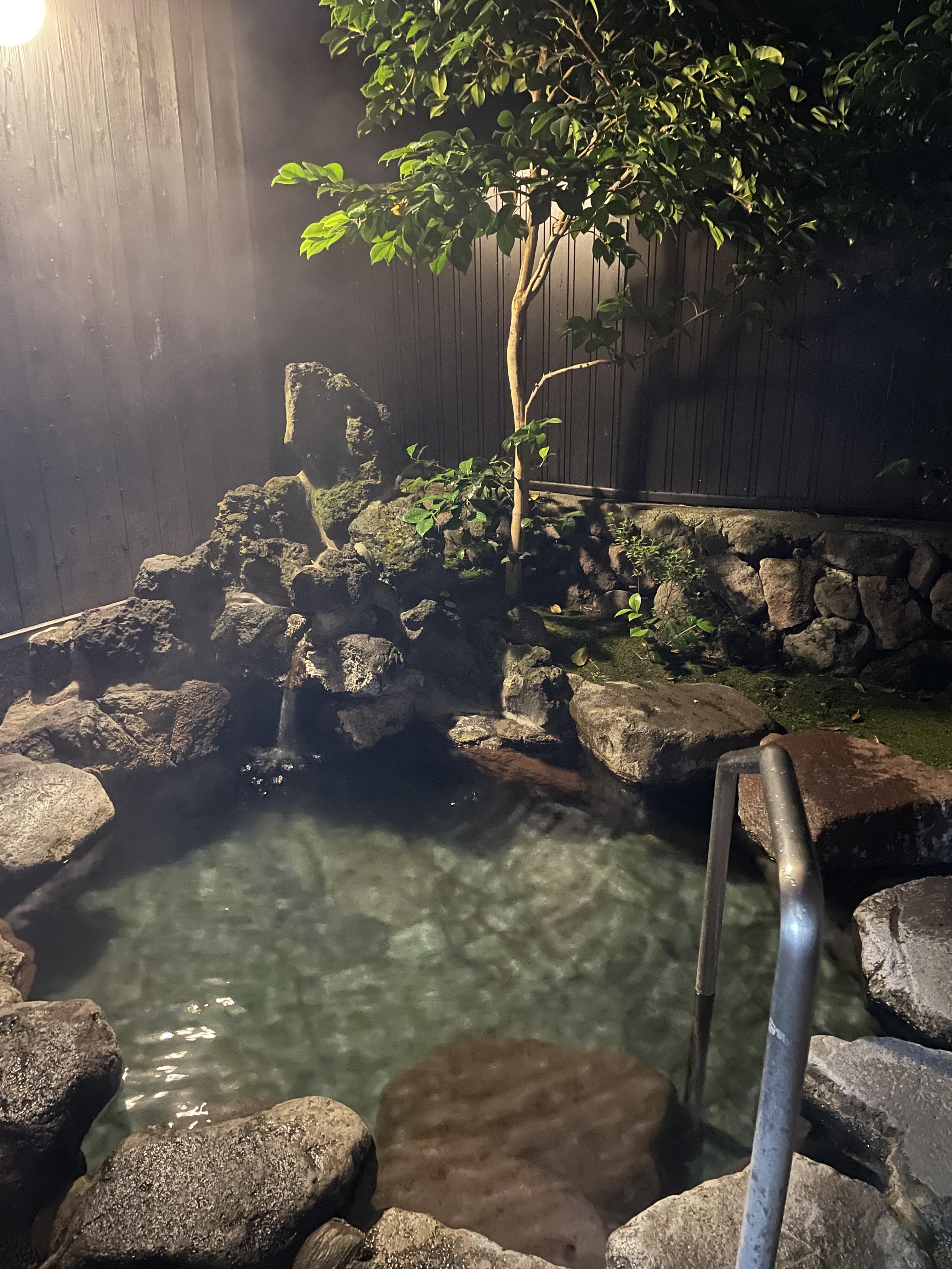 나카탕보다 조금 더 크고 트인 느낌이었으며 조경도 예뻤습니다. 탕에서 맑은 하늘이 시원하게 올려다보였습니다.