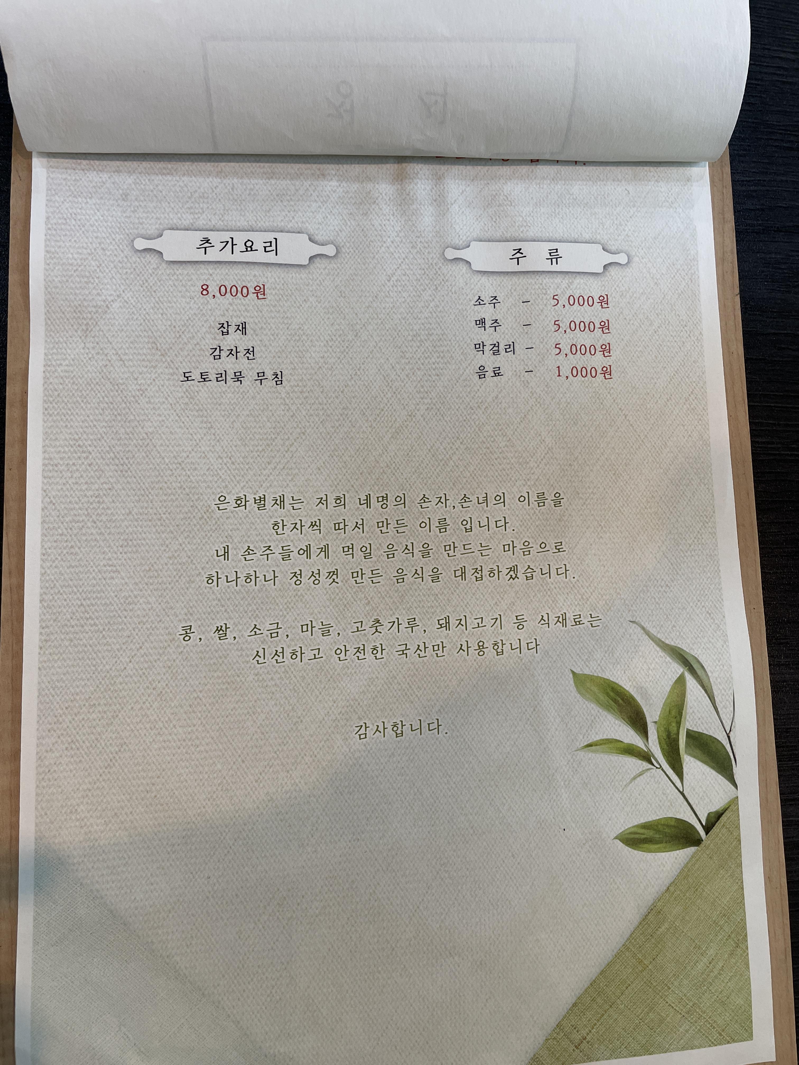수육 포함여부에 따라 은화정식과 별채정식으로 나뉘어요.